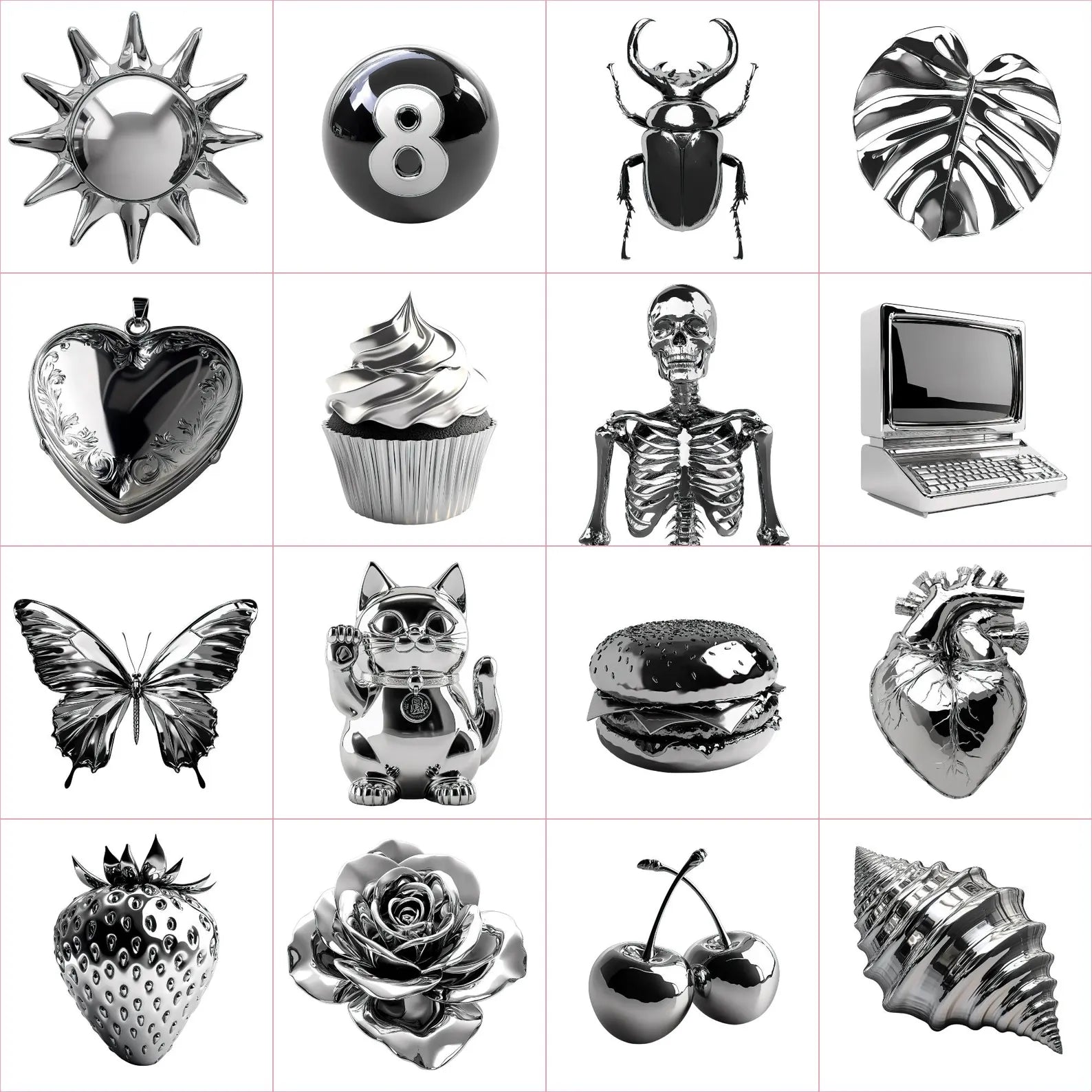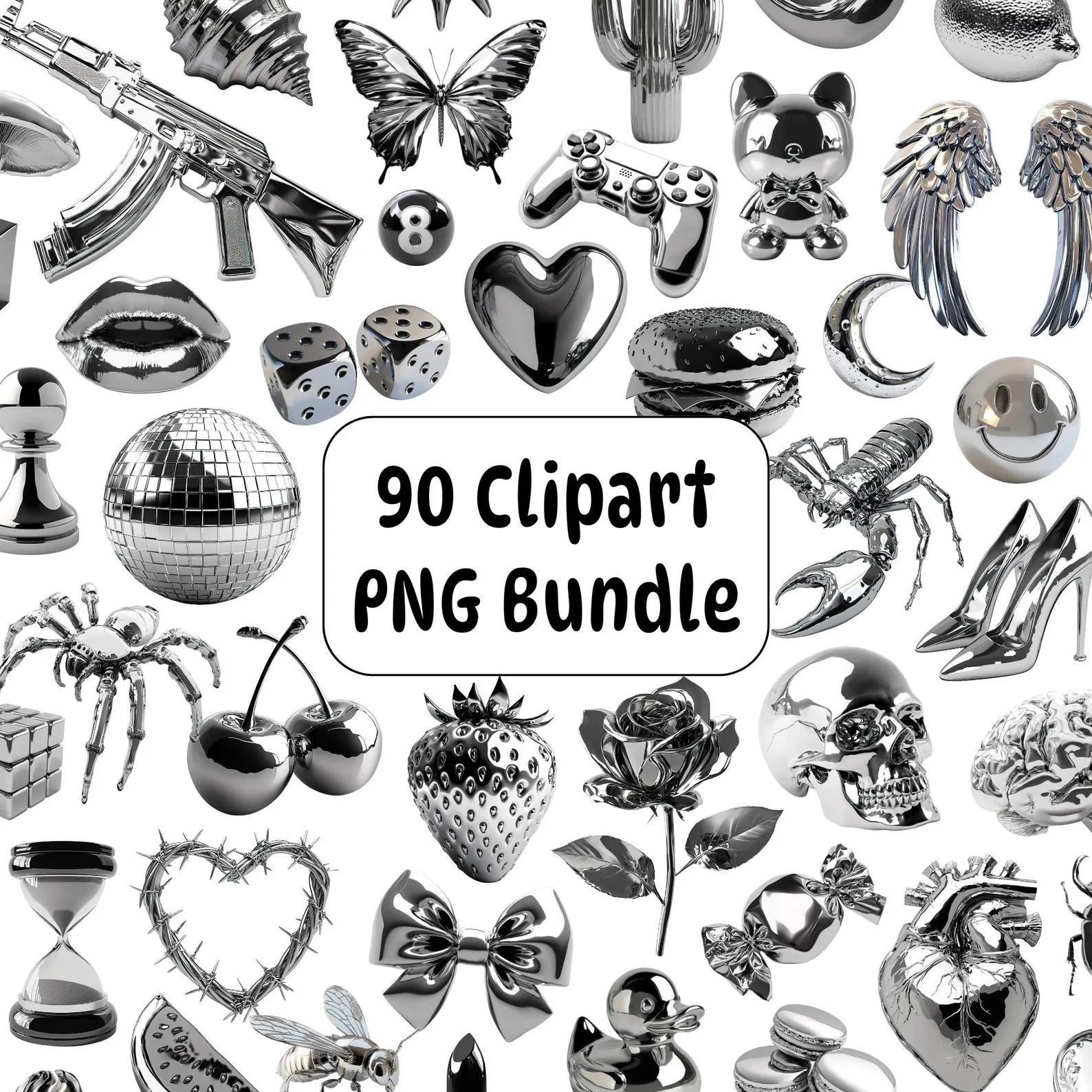 Paquete de imágenes PNG de Chrome, elementos estéticos plateados, elementos metálicos cromados PNG, imágenes PNG de plata Y2K, gráficos de la década de 2000, imágenes prediseñadas de pegatinas digitales